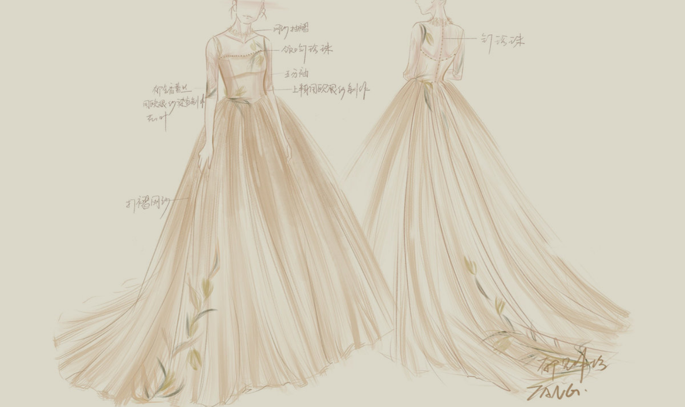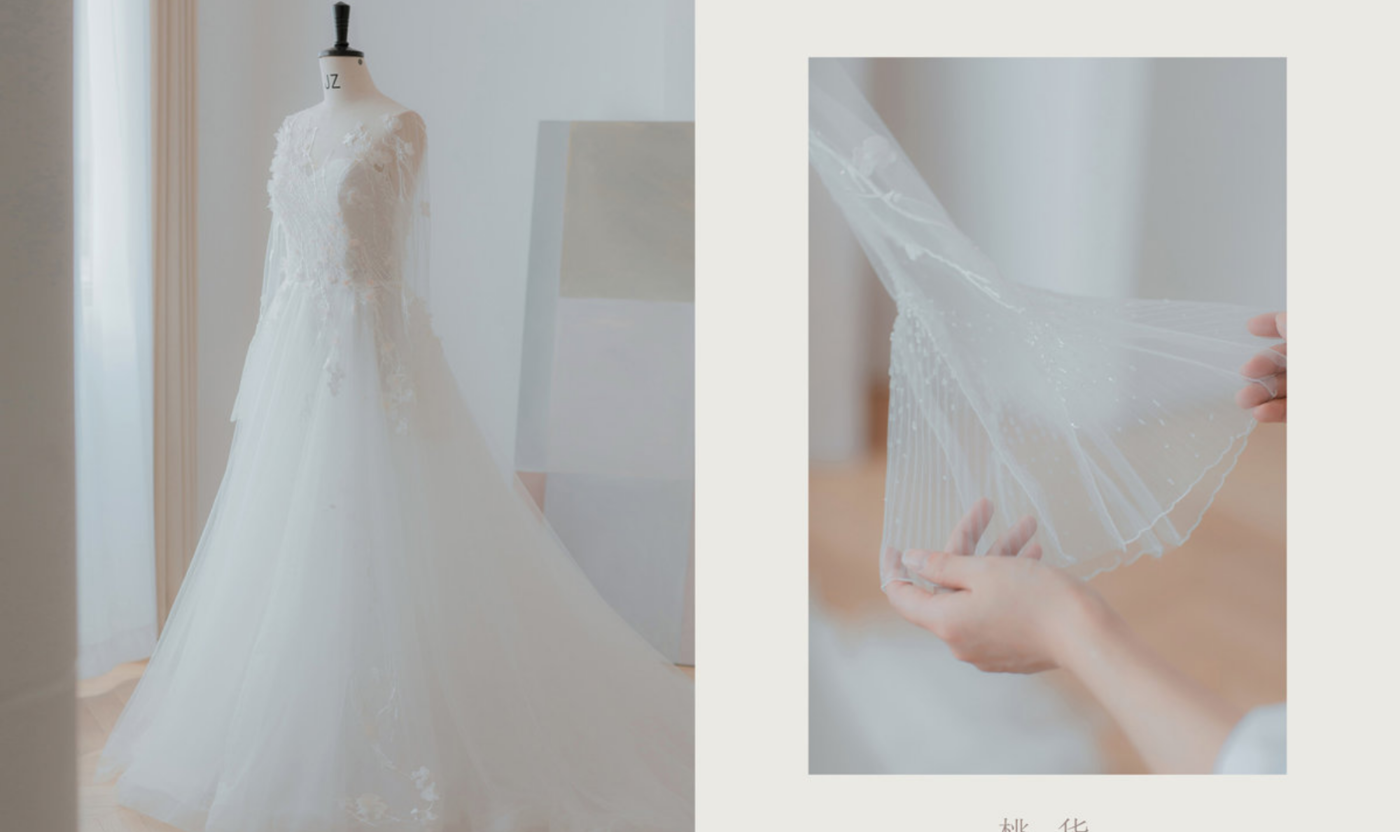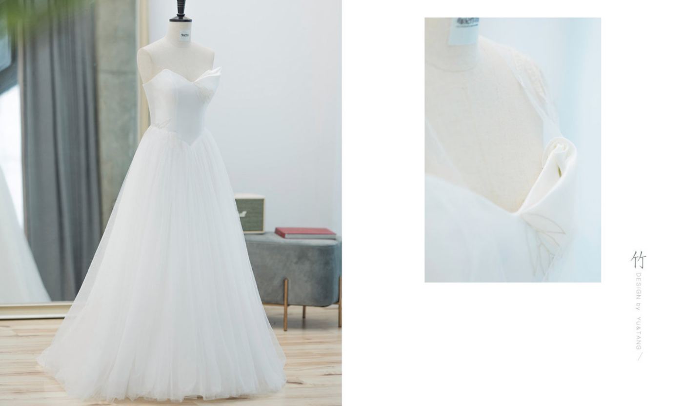 【竹】的设计元素来自新娘名字里的竹 对竹的想象符合钧竹女神清雅恬静的感觉 欧根纱的素面结合了进口#古董珠绣#的精致 少量的竹叶点缀,像是竹叶落在肩头停在衣间 渲染出你给我的第一感觉 🍃[更多…]