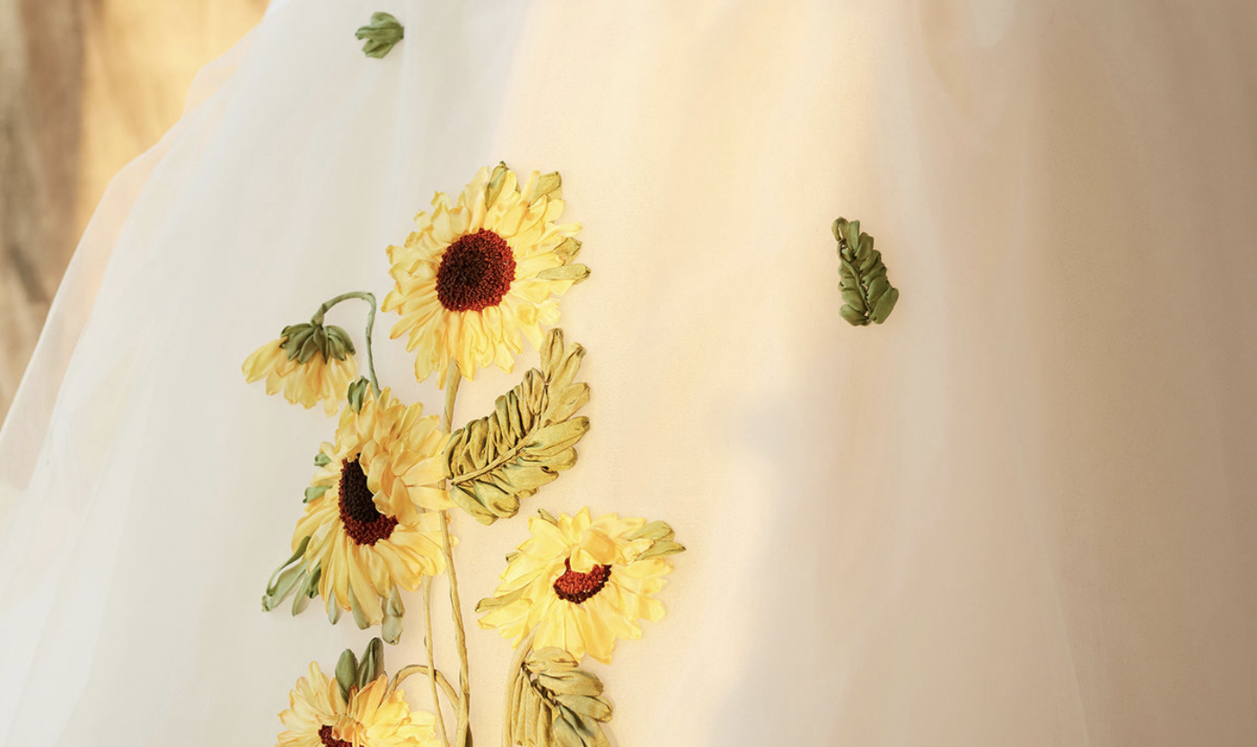 “SUN FLOWER" 新娘手上的向日葵纹身 婚礼当天以向日葵为主元素的婚礼布置 都流露出她对向日葵的迷恋 #丝带绣#和#结粒绣#所结合表现出来的向日葵 如新娘纹在手上的"sun flower" 一样, 也把心中的向日葵留在了她的婚纱上…[更多…]