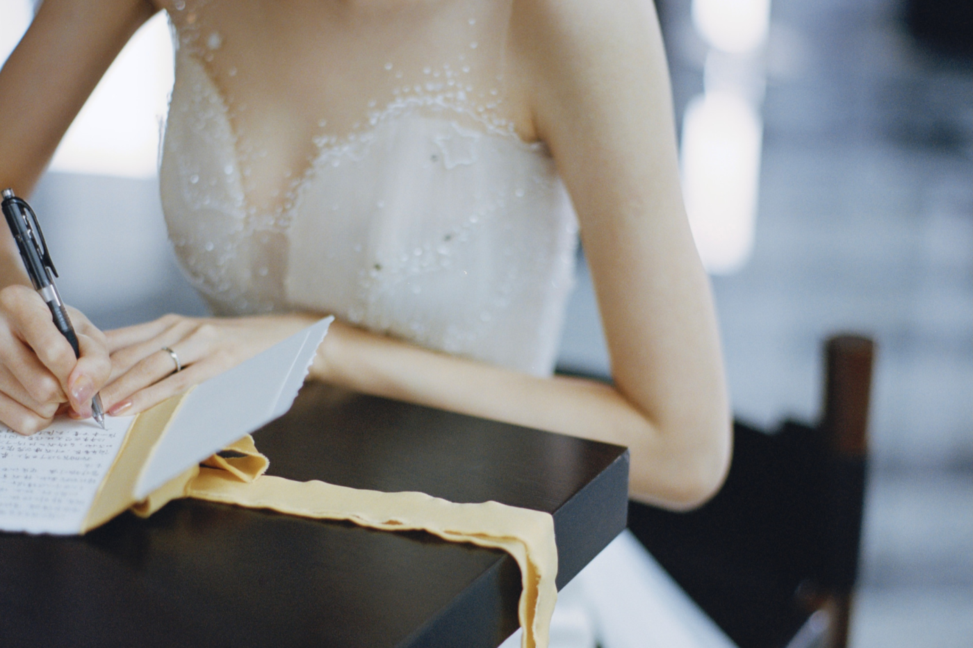 【FS】是她们俩名字的简称 两支象牙白的#古董珠刺绣羽毛笔# 是迎合书吧的婚礼场地,微妙的浪漫 🕊 面料选用40姆米的重磅真丝 厚重的垂坠感给人一种经典传承的仪式感 让婚纱成为像是一本好书似的珍藏品… 📖[更多…]